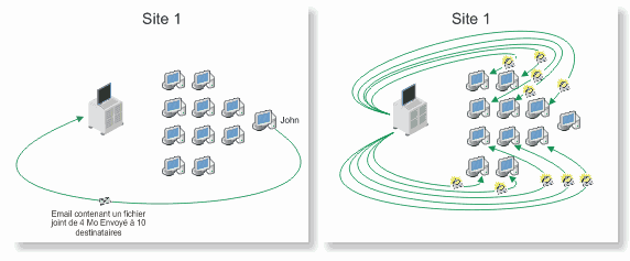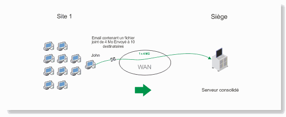 De plus, si les bases de données mail des utilisateurs ne sont pas répliquées localement sur leurs ordinateurs, 4 Mo de trafic WAN sont générés chaque fois qu'un des utilisateurs destinataires ré-ouvre la pièce jointe attachée à cet email stocké dans sa base de données sur le serveur consolidé.