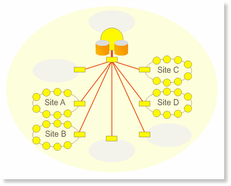 Les serveurs Domino des sites ont été retirés et remplacés par des routeurs connectant les réseaux locaux des sites au (réseau sur lequel se trouve le) serveur consolidé.