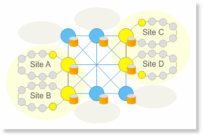 Les serveurs Domino sont les points bleus. Sur chaque site, un serveur