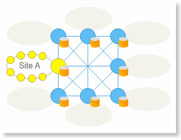 Lorsque, (comme dans l'image ci-dessous), un utilisateur IBM Notes du site A envoie un message à un ou plusieurs utilisateurs du site B, du trafic email est généré sur le lien WAN (trafic payant) entre le serveur Domino du site A et le serveur Domino du site B. Quels que soient le nombre de destinataires sur le site B, une seule copie du mail est envoyé par le serveur du site A au serveur du site B.