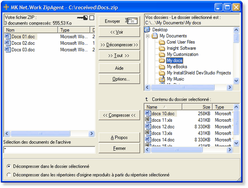 Lorsqu'un fichier Zip ne contient qu'un seul fichier compressé (par exemple un fichier MS Word) et qu'il existe une application associée (par exemple MS Word), ZipAgent lance cette application et charge automatiquement le fichier.