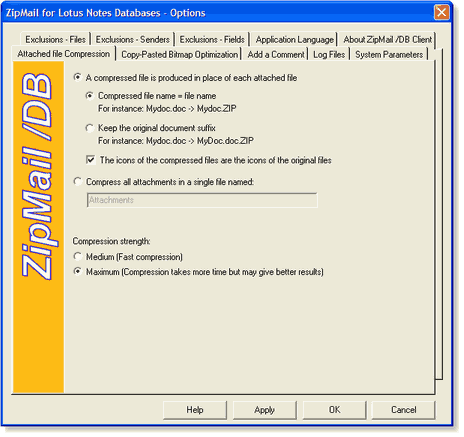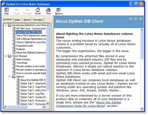 If you are searching for a product running on your Domino servers, that compresses your Notes NSF databases automatically with no need for any user action, please go to the ZipMail /DB Server section of this web site if your servers are running under Windows, else, for Domino servers running under other platforms (Linux, AIX, Solaris, AS400-iSeries and S390), please go to the ZipMail /DB Extended Client section.